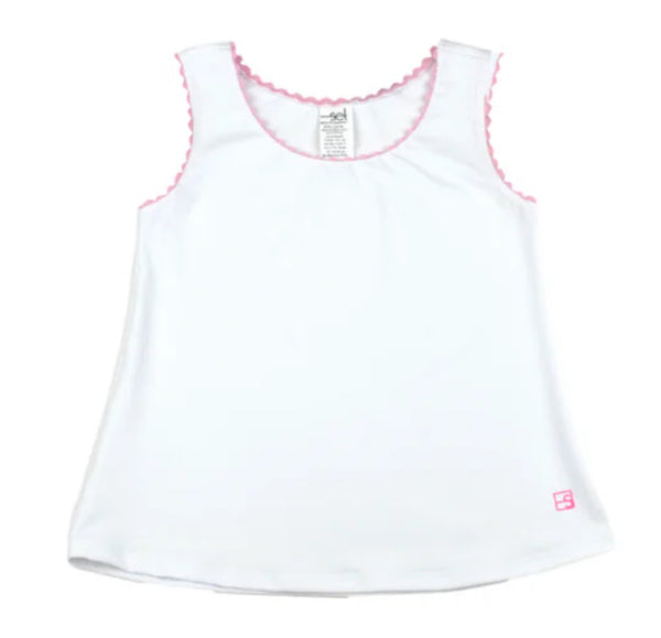Snag it while you can! The Riley Razor Tank is a favorite amongst all the girls! Pair it with any of our cute skorts or shorts, and she'll be SET! 80% Cotton 20% Lycra Pure Coconut athleisure with Cotton Candy Pink ric rac trim