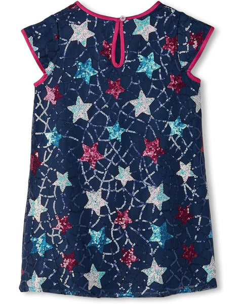 Give your little ones' wardrobe a blingy touch with the Hatley® Kids Starry Sky Cap Sleeve Party Dress. This fit-and-flare dress features a back zip closure, short set-in sleeves with volume with elastic & piping at the sleeve opening, round neckline finished with piping, invisible zipper at center back, and a below-the-knee silhouette. The allover star motifs on the dress are something your little one is going to adore!