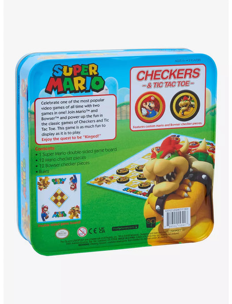 Celebrate one of the most popular video games of all time with two games in one! Join Mario and Bowser and power up the fun in the classic games of Checkers and Tic Tac Toe. This game is as much fun to display as it is to play. It comes in a colorful tin container. Contains 1 Super Mario double-sided game board, 12 Mario checker pieces, 12 Bowser checker pieces and a rule book.