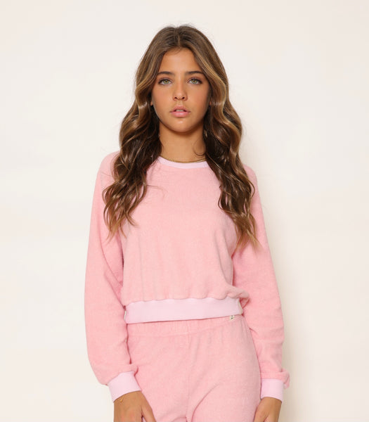 Our Terry Cloth Cropped Crewneck—the summer essential. This crewneck combines the cozy warmth of terry cloth with a cropped cut and elastic waistband. Its relaxed fit ensures easy wearability, while the plush fabric provides an extra layer of warmth for those breezy days or cool evenings.