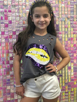 Distressed Purple/Gold Sequin Lips Gameday Tank Top
