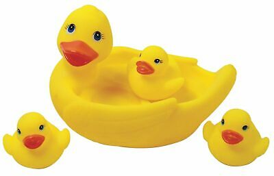Mother Duck with 3 Baby Duckies! Larger Duck floats on water and holds 3 smaller water squirters. Phthalate Free Vinyl Bath Toy. Great for bathtime fun!