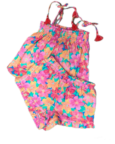 short and tank top set: Top features smocked chest and straps with tassel ties. Shorts have a smocked waistband and ruffle detail at hem.