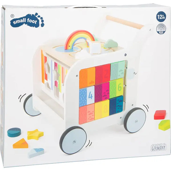 Baby Elephant Walker designed for children ages 12+ months. Includes shape sorting blocks. This elephant themed rainbow baby walker made of wood offers multifunctional play and learn fun on 5 sides. The rainbow and its colors are a central design element. When inserting shapes, pushing it and turning over elements, novice walkers will train their motor skills and learn colours, shapes and numbers. The rubber-finished wheels allow children to be safely and quietly on the move. Under the openable lid with clamping protection, a child´s favorite toys can find space next to the shape-fitting pieces. The integrated axle makes the baby walker robust and smooth-running. The braking system ensures that no accidents happen while finding one’s feet.