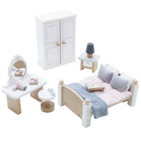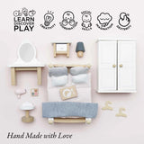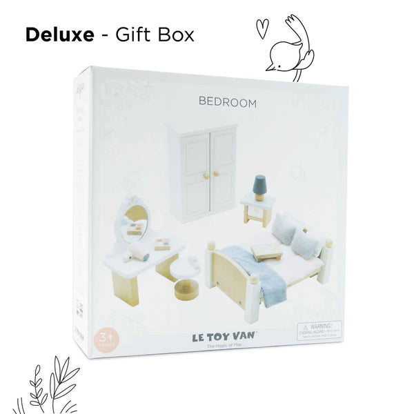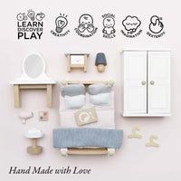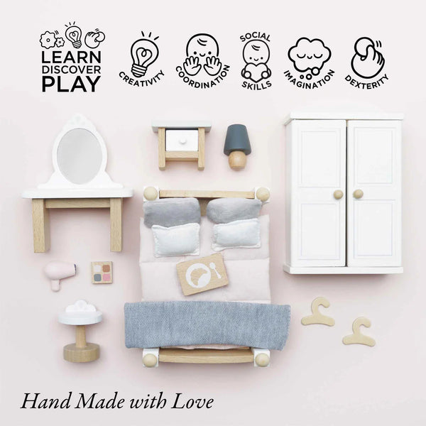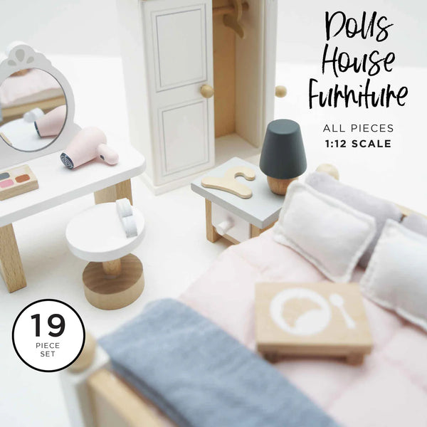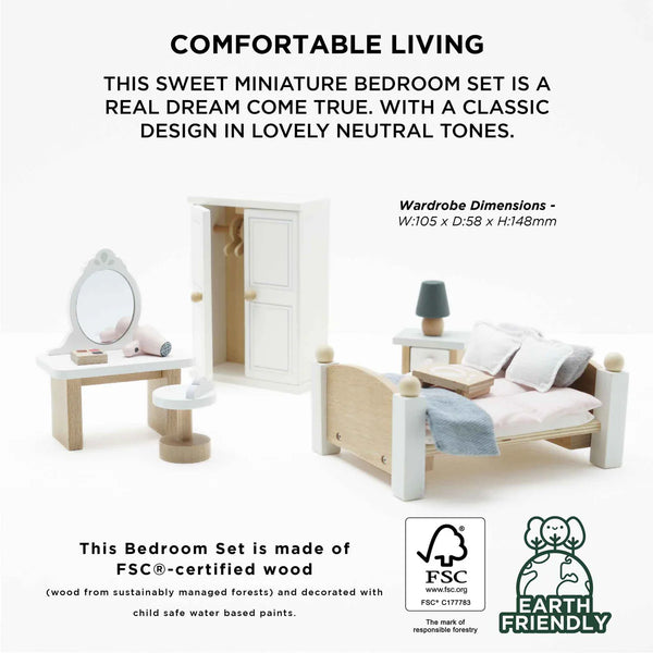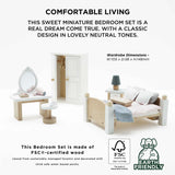 This sweet miniature bedroom set is a real dream come true. With a classic design in lovely neutral tones, it is compatible with all of our beautiful wooden dolls houses and makes a stunning addition to any child’s small world play universe.