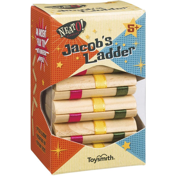 The Jacob's Ladder is a colorful version of a classic toy that will provide hours of imaginative fun. The Jacob's Ladder makes use of a timeless optical illusion to enchant and confound children and adults alike. To set the toy in motion, hold the top block with the single ribbon facing outward. Rotate the wrist forward and backward and watch the blocks fall. Sturdy wooden construction holds up under hours of play. Detailed instructions for use and care are included.