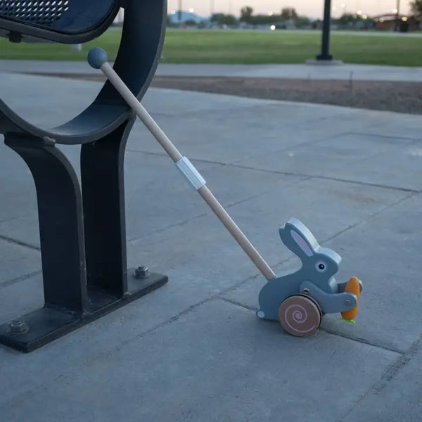Push toys are a favorite of toddlers and parents everywhere. Enjoy our take on this wooden classic with this bunny push toy. Bunny hippity-hops as pushed and raises a little carrot snack. Two-piece stick breaks down to fit in a beautiful gift box, or for easy storage and travel.