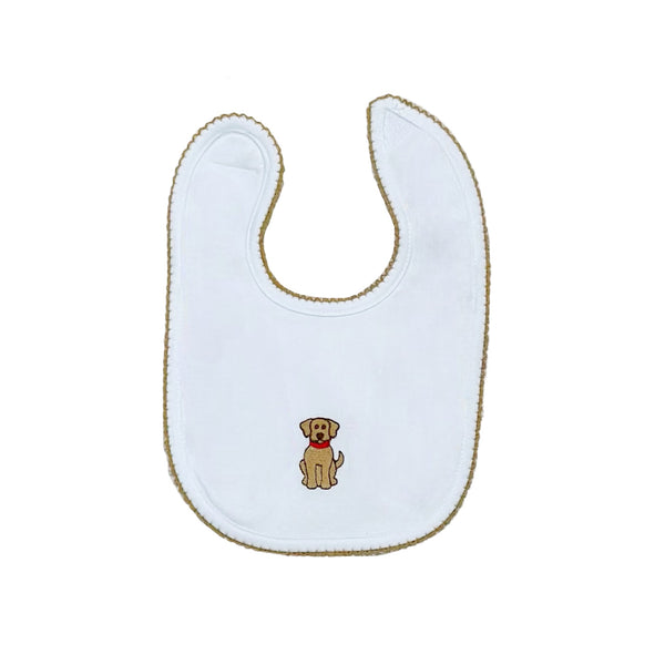 White knit bib with embroidered puppy detail.
